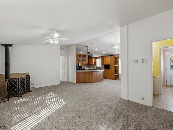 Bring your horses and your cars! This clean move in ready 3 bed 2 bath home sits on approx 1.14 acre of land. Inside the home you will find a split floor plan, brand new carpet, and a wood pellet stove. The comfortable kitchen has a hanging pot rack, plenty of cabinet space, a large pantry and a double oven. The primary suite has a walk-in closet, built in shelves, and the primary bathroom has a walk in tub as well. The 2nd bedroom has a built-in murphy bed and bookshelves, and the front 3rd bedroom has double doors, great for an office. The property offers a large 5-6 car garage on a concrete pad measuring ~24x38 with 3 roll up doors and a side entrance, horse corral in the back yard along with a garden area, 2 additional lighted workshops measuring ~8x12 and ~10x12, private well in a pump house and septic, RV gates, 30 amp power connection, mature trees front and back, fenced backyard, decks front and back, back has a ramp. So much to see, can't list it all. Come see it!