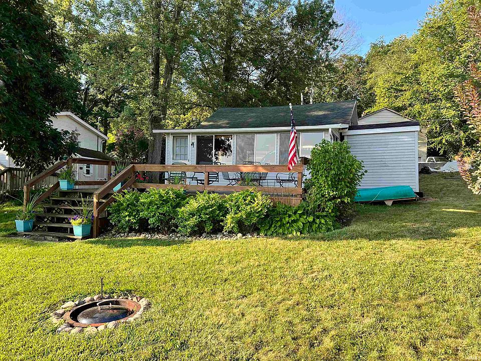 Discover serene lakeside living with this delightful property on non-ski Backwater Lake, perfectly positioned with access to vibrant All Sports Webster Lake through the tunnel. Ideal for those seeking a turn-key short-term rental or a cozy lake cottage, this versatile home is ready to embrace new owners. Step inside to find a comfortable bedroom, an inviting eat-in kitchen, and a warm, welcoming living room. The adaptable family room, currently set up as a second bedroom with bunk beds, offers ample space for guests. A spacious bathroom with a stand-up shower ensures convenience and comfort. Outside, the expansive 12x24 lakeside deck is the perfect spot for entertaining or relaxing while soaking in stunning lake views. This cottage comes fully equipped with appliances, lake decor, furnishings, pier and a Rinker Deck boat. Please note, the Blackstone Grill and two exterior deck chairs are excluded from the sale. Whether you're looking for a short-term rental opportunity or a private lakeside escape, this property offers both relaxation and potential! Don’t miss out on this affordable lakefront property!