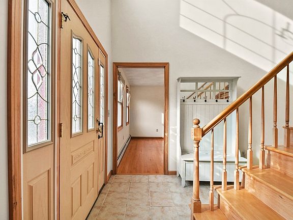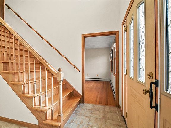 Welcome to this beautiful 3-bedroom, 1.5-bathroom home located in a quiet cul-de-sac. The first floor features a welcoming entryway with a transom window above the front door, filling the space with natural light. The dining room boasts stunning hardwood floors and a chandelier, while the kitchen is equipped with tile flooring, stainless steel appliances, and a door leading to the attached 1-car garage. A cozy living room opens to the backyard through sliding doors to a wood deck. The first floor also includes a convenient half bathroom. Upstairs, the primary bedroom offers a walk-in closet with attic access and direct access to the full bathroom, which features tile flooring and a linen closet. Two additional bedrooms complete the second floor. The unfinished, heated basement includes washer and dryer hookups and door leading to stairs to the backyard. The paved driveway provides parking for up to four cars. This home combines charm, functionality, and a great location.