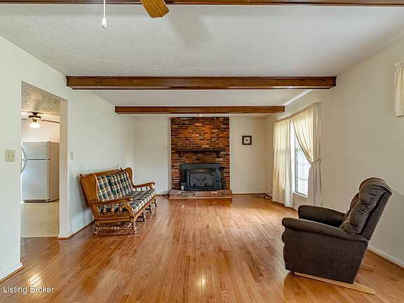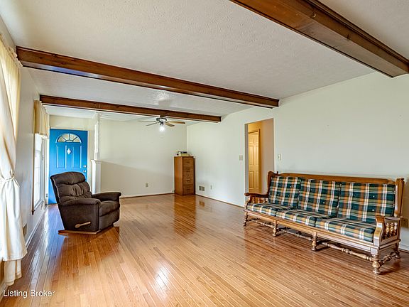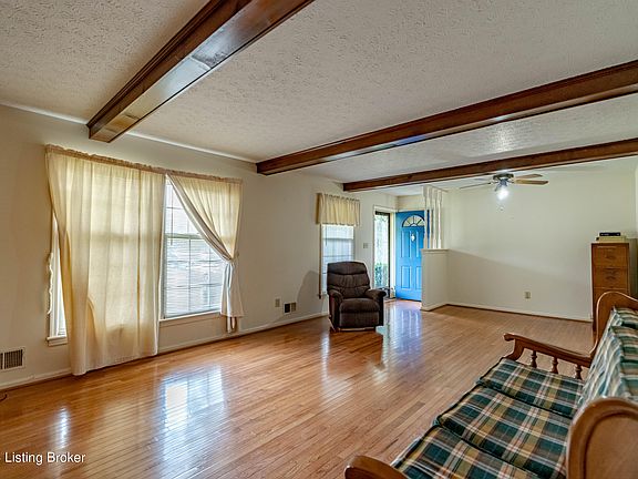 Upon entering, you're greeted by a warm and inviting living space highlighted by hardwood floors and ample natural light. The kitchen features blue tone cabinetry, and plenty of cabinet space.