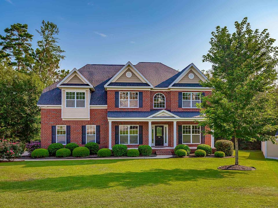 This all brick 2 story 5 bedroom 4 1/2 bath home with 2 master suites (one on each level) is located at the end of a cul-de-sac on a .56 Acre lot in an all brick golf course community with all side loading garages. The main level master with 9' box ceiling, stained double vanity with granite counter tops, tiled floor, walk-in closet, & shower w/a seat is perfect for in-laws. The large 2nd floor master has a vaulted ceiling, bay window in the sitting area, 3 walk-in closets, a jetted tub, separate shower with a seat, separate stained vanities w/granite counter tops, & tiled floor. This is an open floor plan w/hardwood floors & 9' ceilings, & crown molding in the formal living room/office, dining room, dinette, kitchen, & great room with coffered ceilings. Upstairs is a large bonus room that could be a play room, media room, or game room. The home has been piped & wired for a central vacuum system. One just needs to attach a vacuum in the garage. The Eat-in Kitchen has 42" stained raised panel cabinets, granite counter tops, lazy susan, bar seating 4, & 9" deep double bowl sink. There is a utility sink in the garage, a deck off the great room, & a tankless hot water heater. There is a laundry room off the kitchen. 2 of the guest bedrooms have vaulted ceilings.