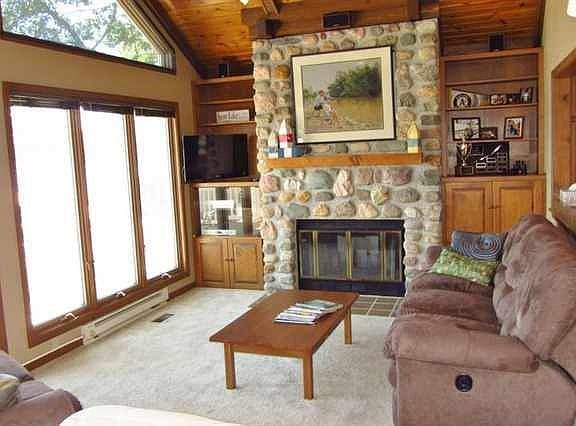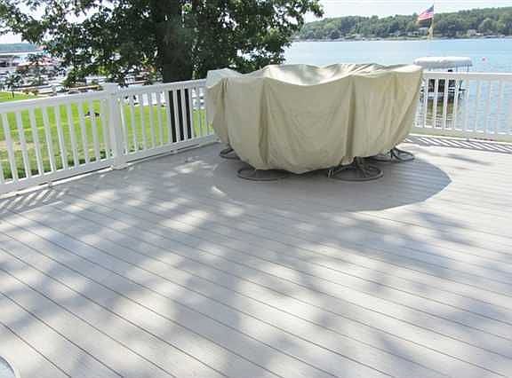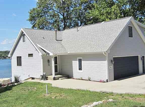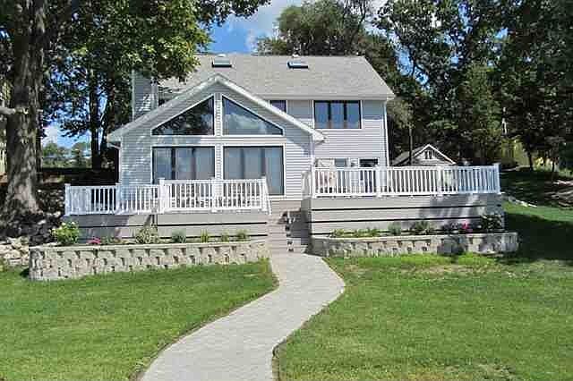 Like Hitting the Jackpot! The lakefront home has so much to offer. There are 5 bedrooms and four baths offering plenty of room for family and friends. The upper level guest quarters feature a kitchenette with refrigerator and microwave, living area, 2-loft BR???s and a full bath. This home is absolutely immaculate inside and out! Cathedral ceilings, wall of windows and a stone fireplace are featured in the living area. The kitchen is fully equipped including double wall ovens. Enjoy sparkling lake views and plenty of outside entertaining on the new maintenance free deck. The nicely landscaped yard has a paver brick walkway that leads to the pier. This is an outstanding buy! All appliances and the weed roller are included.