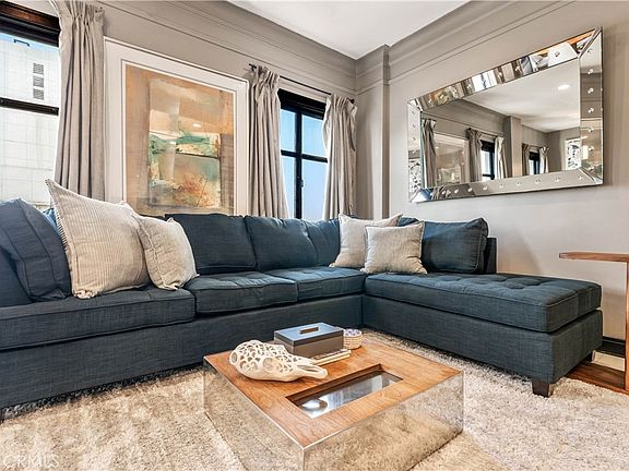 Perched on the 9th floor of The Lafayette Building, this beautifully furnished 2-bedroom, 2-bathroom corner residence offers a sophisticated urban lifestyle in Long Beach's vibrant East Village Arts District. The home features striking Australian Sandstone flooring and a fully renovated kitchen adorned with Brazilian Mahogany wood floors, granite countertops, a sleek glass backsplash, and an elevated breakfast bar perfect for casual dining or entertaining.
