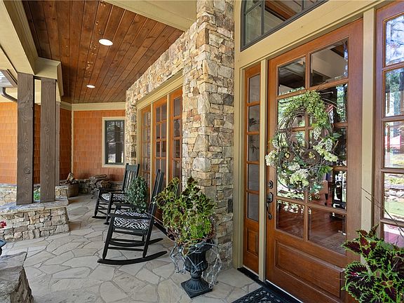 Thoughtful design is immediately evident as you cross the flagstone front porch w/its dry stack stonework & see the beveled glass windows & doors that brighten the entrance. Inside, an expansive open floor plan is cleverly divided by elegant dark wooden columns. The great room features a stone fireplace with a raised hearth & striking windows meant to show both the beauty of the room & the view beyond it. The real star of this living space may just keep you looking up. The 10-foot, wood-planked cathedral ceiling is a wonder in & of itself, but the architecture of its intricate beams makes it a work of art.
