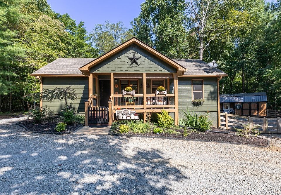 Look at just one photo and you'll quickly seeGthis home and property is impeccable! Every inch seems thoughtfully planned and properly cared for. From the entrance of the property, parking area, landscaping and front porch w/shades, to the fenced-in yard, back patio and shed with its own porch area, no spot has been overlooked. Head inside to find a split layout with a full suite on each side. LR & sunroom, both w/ vaulted ceilings, exposed beams & stacked stone gas FP. Huge eat-in kitchen with island, S/S appliances, solid surface c'tops, & added lighting. 2 full BR suites, one w/ walk-in closet/laundry, and tiled tub shower. Community amenities include gated entrance, 2 community centers, and rec center w/ heated pool, fitness center, game room, tennis, basketball, pickleball, mini golf, & covered outdoor pavilion. Plus parks, 2 outdoor pools, & RV park. Just 16 miles SW of DT Ellijay.