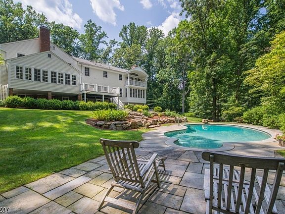 New to the Market - Custom Colonial situated on 5+ acres on a private cul-de-sac location. Bernardsville's tax records, 5,756 on living level, in basement 2,476. Finished basement area 1,980. Enjoy peace and tranquility looking out to the in-ground pool from the blue stone patio and deck. The first level offers a very open floor plan. The gourmet kitchen has stainless appliances, granite and overlooks the family/breakfast room. Spacious living room, office, sunroom and den all on the first level. Second level offers a master bedroom with a custom fireplace, his and her walk in closets, full bath and deck. Four additional bedrooms, two full baths, sitting room and laundry room also on second level.