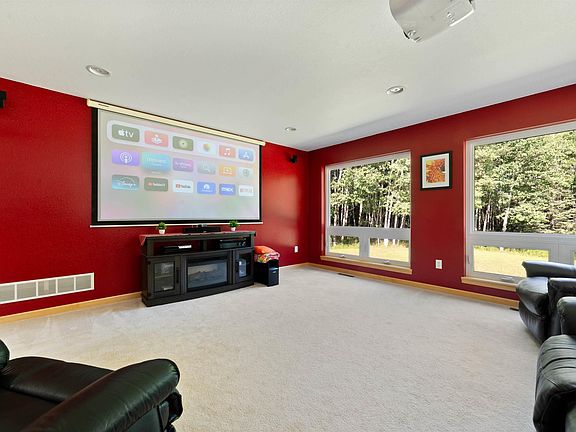- Description: Sunny, huge windows overlooking wooded back area, surround sound, projector screen