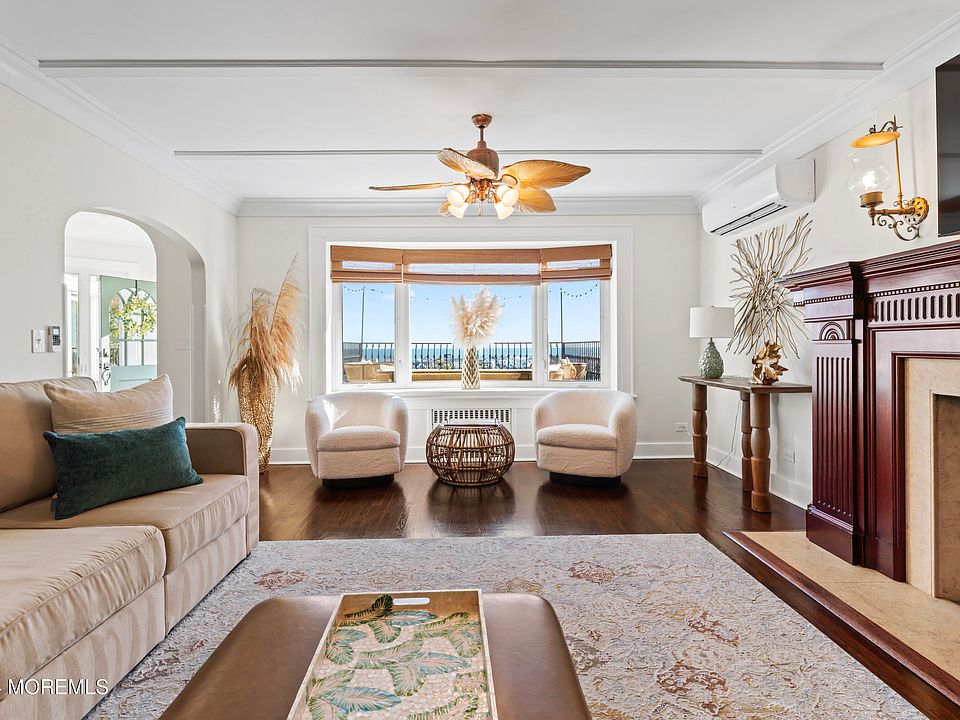 - Balcony, Beamed Ceilings, Center Hall, Crown Molding, Recessed Lighting, Wall Mirror, Wet Bar