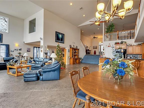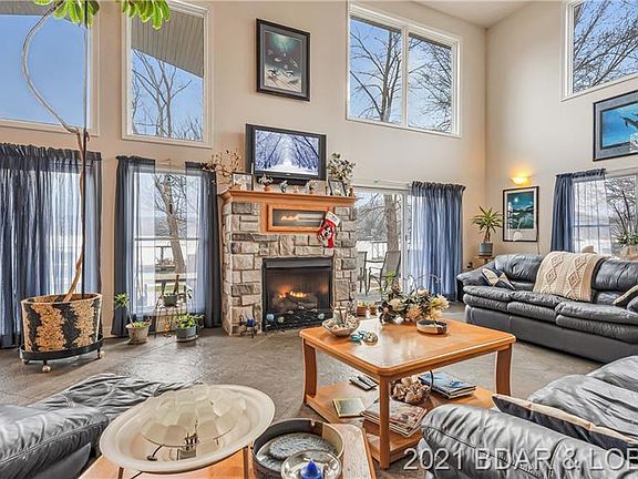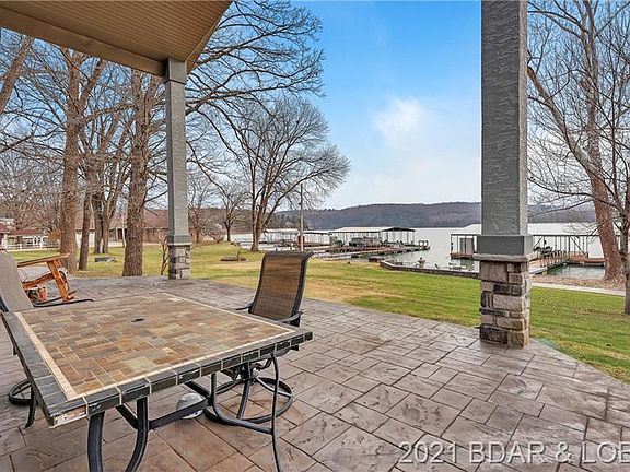 Looking for an open floor plan lakefront home on a FLAT lot? Look no further! Upon entering this 6bed/4.5bath home, you'll notice the wide & inviting entryway, cathedral ceilings and HUGE lakeview. Nice open floor plan with great entertaining space. Great garage space with an oversized 2 car garage on one side and a RV garage on the other side. Large master bedroom on lower/main level with office space and amazing lake view, walk-in shower, jet tub and walk-in closet. Another master suite on upper level with lakeview. Home features stamped concrete floors, beautiful stone gas fireplace, great natural light, quartz & granite counter tops, gas stove, oak cabinets, large covered back patio that walks out to FLAT yard, fenced in side yard and spacious dock. Upper level contains 4 other bedrooms and 2 full bath with family room in middle and overlooks the main living area downstairs. Home is located just outside of Camdenton about 7min. from town. Hurry to see this one before it's too late!