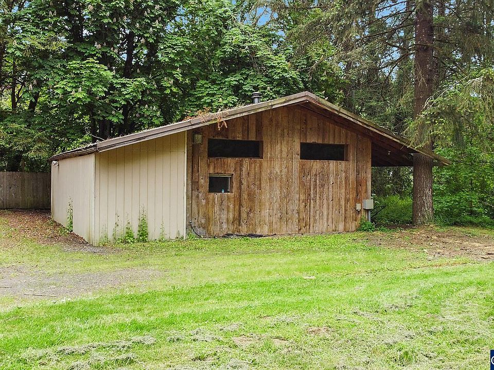 Excellent close in country location with creek setting. Older home needs TLC & finishing. Vaulted great room w/wood plank accents &storage loft. 2 potential bedrooms both have NO closets. Creek view from living area. Creek has small footbridge. Nice large 5 bay 1012+/- Sq. Ft shop w/power, bonus room & car work pit. Existing well & septic. Property is partially fenced and lined with trees for privacy. Kitchen was removed. No current heat source. Great potential! Selling AS IS & cash only.