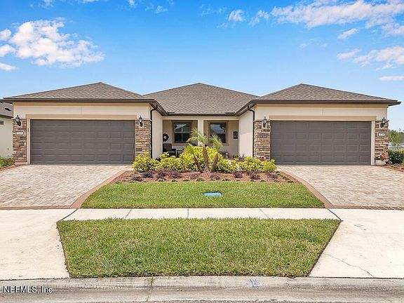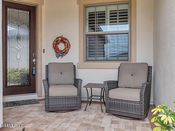 Welcome to this stunning Cressida model built by Pulte Homes shows better than the model!! Enjoy the Maintenance Free boutique community with only 167 homes. A gracious entry welcoming visitors into a lovely foyer. The large gathering room and dining area are adjacent to the Kitchen with spectacular views out through the family room to the extended screened lanai. This premium waterfront home site is like paradise. Relax by the fire pit while watching a beautiful sunset reflecting off the water. Kitchen features quartz countertops, tile backsplash, island seating, gas range & stainless appliances. Large Owners suite, dual vanities, large walk-in seamless glass shower, spacious walk-in closet.You'll love the 2 car garage, lifetime warranty epoxy garage floor, utility sink & small work bench Plantation Shutters throughout and Tray Ceilings in the Foyer, Den and Master Suite. Tile throughout the main living area and the Office/Den. Laundry room has washer & dryer, upgraded built-in shelving and cabinets from the builder. Welcome home to this low maintenance free living with lawn care included, mowing, fertilization, irrigation and use of the heated pool just for the 55+ community. The community is quiet and close to shopping, easy highway access, 20 minutes to Vilano Beach and Downtown St.Augustine. Short drive to the new Costco, Buc ee's and new restaurants and shops opening soon. These Villa's sell very quickly, so this home truly won't last long!! Move In Ready!! Great Location!! The Seller is willing to convey all the Furniture/TurnKey if a buyer is interested for a separate price.