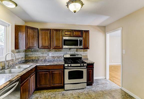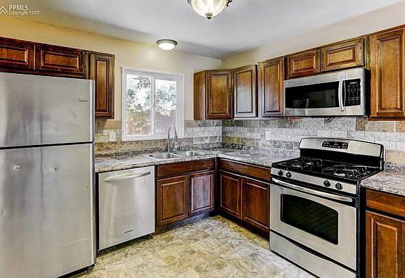 Absolutely stunning & move in ready! Gorgeous hard wood in sunny living room & all bedrooms! Stucco, wood burning fireplace & chair rail molding add unique charm! Spacious eat in kitchen updated w/ stainless steel appliances, gas stove & attractive tile back splash! Updates continue throughout including fixtures, doors and bathroom vanity! Incredible mud/laundry room attaches one car garage and walks out to fenced in rear, adding tons of extra cabinetry & extra counter space! Plus large storage shed in back! Won't last! Awesome location in well established neighborhood with mature trees! Nearby parks, schools, shopping, dining, gym and 15 minutes to Ft Carson! Come see today!