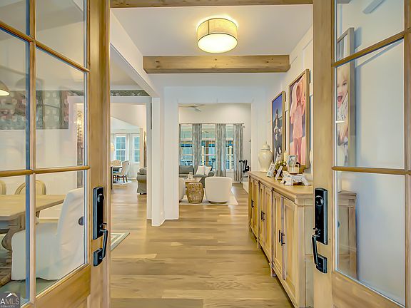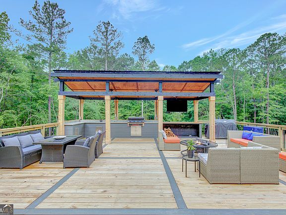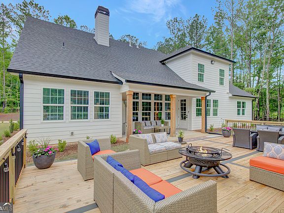 EXQUISITE & REFINED LIVING awaits in this nearly new 5-bedroom, 3.5-bath estate, perfectly positioned on 1.6+ private acres in the coveted Northgate school district. Just steps from the picturesque 300-acre Brown Reservoir, this residence blends upscale comfort with extraordinary craftsmanship and a resort-style outdoor experience. Step onto the charming front porch, finished in brick flooring and framed by dual daybed swings, creating the perfect spot to unwind. Gorgeous wooden double doors open into a home filled with natural light, elevated finishes, and an effortless, elegant flow. A sophisticated dining room trimmed with board and batten and designer wallpaper welcomes your guests before leading into the warm and inviting family room. Here you'll find a stunning stacked-stone fireplace, exposed beams, rich hardwood floors, and a stylish built-in workstation. The gourmet kitchen is a standout-expertly designed with a quartz-topped island, farmhouse sink, expansive cabinetry to the ceiling, a walk-in pantry plus a second scullery/pantry, a butler's pantry with coffee bar, and premium appliances including double ovens, a 5-burner gas cooktop, and a drawer microwave. A breakfast bar and inviting dining nook make this space both functional and beautiful. The main-level primary suite is intentionally serene, featuring a custom accent wall and a spa-inspired bathroom with a soaking tub, oversized glass-and-tile shower, and a beautifully organized custom closet. Two additional main-floor bedrooms share a full bath with thoughtful placement and design. Convenience continues with a large mudroom offering built-in seating and storage, along with an expansive laundry room featuring custom cabinetry and a utility sink. A private staircase leads to the upper level, where you'll find two more spacious bedrooms, a full bath, and a massive bonus room ideal for a home theater, recreation space, or creative studio. The oversized 2.5-car garage features an epoxy floor and EV charging station, plus an additional charger located off the driveway. The backyard is a true highlight-your own outdoor sanctuary. Enjoy a covered outdoor kitchen with granite counters, built-in Blackstone grill, sink, and dedicated firewood storage. An inviting dining terrace, cozy fire pit area, and additional covered patio create endless spaces to relax or entertain. All this, with no HOA to limit your lifestyle. Enjoy boating and fishing at the nearby reservoir and the convenience of being minutes to the new Publix shopping center and I-85. This property delivers luxury, functionality, and an unmatched lifestyle-a rare offering and absolutely one you must experience in person.