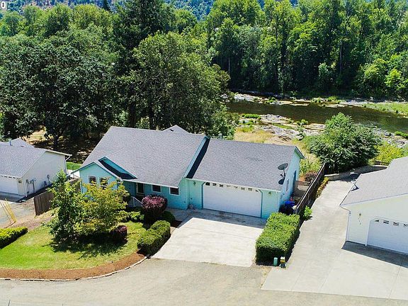 Lovely South Umpqua Riverfront home on .79 acres with fenced yard and gated river access. Foyer entry opens to main living area including office/den, half bath and formal dining room. Lower floor consists of 2 bedrooms, full guest bath, utility room and master suite opening to back yard patio area. Additional features include vaulted ceilings, breakfast area, new carpeting, laminate flooring and sweet river views!