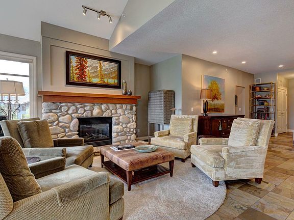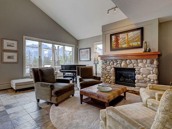 Newly renovated two bedroom plus den in the Pinnacle. Situated in Silvertip and perched at one of the highest elevations in Canmore, this single level residence in the Pinnacle offers panoramic mountain views, year-round sunshine and exceptional privacy. Located in an ideal spot in this concrete building with no unit above and only front hall and den sharing a wall with next door neighbour. Set within an exclusive golf course community, this professionally renovated spacious two bedroom plus den home blends luxury with low maintenance mountain living. The chef-inspired kitchen features custom cabinetry with high-end appliances flowing seamlessly into the grand living area with a stunning fireplace.Through expansive windows that wrap around the open concept kitchen, dining and living areas enjoy breathtaking, unobstructed views of Canmore's most iconic peaks. The spacious deck offers a seamless extension of your living area, where you can relax and take in the tranquil mountain scenery. Thoughtfully designed for comfort and privacy, the primary suite is tucked away from the main living areas and features stunning views, walk in closet, a generous ensuite with a soaker tub and a separate shower. A guest bedroom and a versatile den offer flexibility for hosting or working from home. Additional features include a laundry room, plenty of storage, two indoor heated parking stalls, a massive storage room in the parkade and direct access to Canmore's extensive trail network—ideal for hiking, biking and exploring right from your doorstep. Whether you're seeking a full-time residence or a weekend escape, this elegant mountain home is the perfect retreat in the heart of the Rockies.
