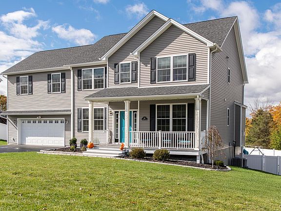 Welcome to Stratford Farms – An enclave of modern luxury. Built in 2018 and pristinely maintained, this 4 bedroom 2.5 bath Colonial in the acclaimed Arlington School District offers a seamless fusion of style, sophistication, and high end comfort. From the inviting rocking-chair front porch to the rich walnut-toned hardwood flooring throughout, this home exudes warmth and quality at every turn. The first floor features a formal living/flex room and a formal dining room, ideal for entertaining or a home office setup. The open-concept kitchen and family room are the heart of the home - enjoy the cozy gas fireplace with custom remote-control blinds, and a gourmet kitchen boasting a massive center island, stainless steel appliances, and granite countertops with a unique leathered finish. Sliding glass doors lead to a spacious 16’x20’ deck, perfect for outdoor gatherings. Convenient access from the two-car garage into the kitchen with minimal steps - adds ease to everyday living. A stylish half bath completes the main level. Upstairs, the primary suite impresses with a large walk-in closet and a luxurious ensuite bath featuring an oversized walk-in shower and double-sink vanity with granite countertop. Three additional bedrooms offer generous space, complemented by a full hallway bath with tub/shower combination and a dedicated laundry room with utility sink. A full, unfinished walkout basement provides endless possibilities for future expansion – perfect for recreation room, home gym or media space. With high ceilings, backyard access, and abundant storage – this level combines flexibility with functionality. You’ll love the extras! - custom blackout blinds throughout, recessed lighting, central air, an Energy Star Navien hydronic boiler, and so much more. Enjoy outdoor living on the brand new paver patio or take a dip in the 21-foot round saltwater pool - all within your own private, fully fenced backyard oasis. The home is also hardwired for an alarm system with full property radius cameras for added peace of mind. With natural gas, municipal water, and community sewer, this home checks every box. Just minutes to Adams Fairacre Farms, East Dale Village, The Empire State Rail Trail and the Taconic State Parkway. This move-in-ready home combines comfort, privacy, and modern amenities - perfect for today’s lifestyle!