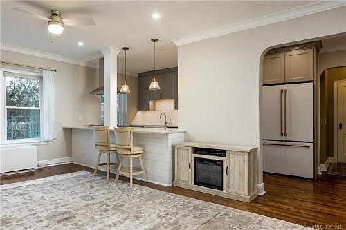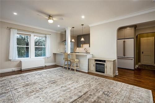 One of a kind You will fall in love with this completely renovated one bedroom, located in the heart of Stamford. The brand new, stylish and sleek, gourmet kitchen, includes GE cafe appliances and farm sink as well as a coffee and breakfast bar. There is hardwood throughout, recessed lighting, ceiling fans, and all new windows in this elevated first floor unit. Bedroom is outfitted with an Elf closet system, allowing for great storage and organization. Enjoy cozy nights in the living room with its fireplace TV stand.. This wonderful downtown location offers plenty of off street parking, a short walk to scalzi park, shops, restaurants and more. This won't last