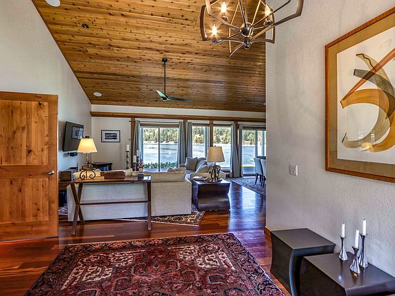 Experience waterfront living at its finest on the Pend Oreille River from this stunningly private setting on .72 acres with 273 feet of low bank rip-rapped shoreline, a sandy beach, and dock with a 10,000 lb boat lift & two jet ski lifts. This single-level home has undergone numerous recent updates including new lighting, fixtures, surround sound, appliances, a reverse osmosis system, updated landscaping & more. The home boasts 3200 square feet of living space, 4 bedrooms, 3.5 baths, an open concept in living and dining room with tongue and groove ceilings, a gas fireplace, beautiful Koa wood floors, and a gourmet kitchen with granite countertops, commercial-grade gas range/oven, stainless steel appliances, wine fridge, an island with bar seating, and a pantry. The main floor master suite features a walk-in closet, en suite bath with tile accents, a soaking tub that overlooks the river, and an attached sunroom with views in every direction. Two additional main floor bedrooms each have access to a covered wrap-around deck and a full bath with tile accents and dual sinks. The second level bedroom suite includes a separate office/bonus room area. The 3-car attached garage offers ample storage for your boat and RV, while a detached storage building is perfect for all your toys. The property is fully landscaped with a sprinkler system and drip irrigation. Located approximately 25 minutes from Sandpoint and not much further to Schweitzer Ski Resort. Enjoy endless water activities including the nearby water ski course. This home offers the perfect combination of waterfront living and convenience.