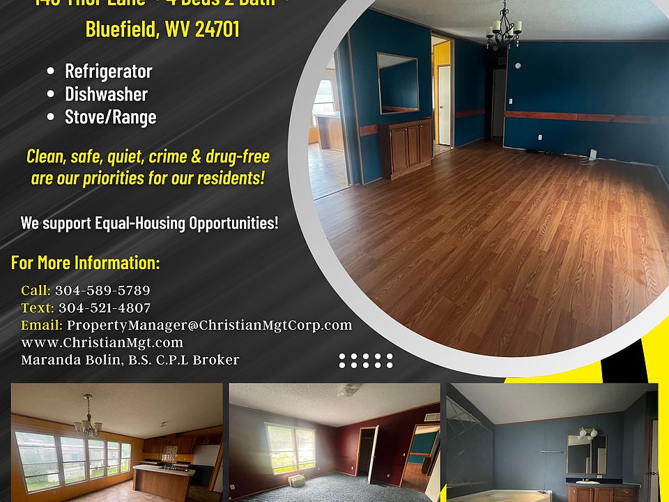 140 Thor Lane ~ 4 Beds 2 Bath ~ Bluefield, WV 24701 LEASE OPTION (Path to Home Ownership): Initial payment: $2,500 with no payments due until the 1st of the following month! Monthly payment: $1,050/month. Includes lot rent & curbside trash pick up. or RENTAL: Security Deposit: $1,050. Can be made in payments if needed. Monthly payment: $1,050/month. Includes lot rent & curbside trash pick up. Sorry, this home is not HUD approved. Large 4 bedroom, 2 full bathroom doublewide for rent! If you're looking for extra living space and storage this home has it all! Open floor plan with large living room connected to the dining room and kitchen. Kitchen features a middle island with sink and extra counter-space for cooking and entertaining. Furnished with a stove, refrigerator and dishwasher. Separate laundry room that leads to the back porch and has storage for laundry supplies and hanging clothes on! Oversize bedrooms with large closets. Extra storage closets and numerous windows that let in natural sunlight throughout the entire home. Built in entertainment stand area in the living room. Master bedroom features a walk in closet. Master bath is attached to master bedroom with separate garden tub and a standup shower. Linen closet is located inside the master bathroom for convenience. Monthly rent includes lot rent & weekly curbside trash pick up. Located on the first lot as soon as you go into Hideaway MHC. No mobile homes in front or on one side of the home. Paved two car driveway with additional parking. Outbuilding goes with the home for even more storage! Large front porch for entertaining outside of the home. Ready to be moved into today! Christian Management Corporation Office Hours: Monday, Wednesday and Friday from 9:00AM-5:00PM & the first Saturday of every month from 10:00AM-2:00PM We will be closed to the public every Tuesday and Thursday. You can view THIS property 7 days a week! Most pets welcome with a $300.00 pet fee per pet and signed pet agreement. Maximum 2 pets. No aggressive breeds due to insurance restrictions. Clean, safe, quiet, crime & drug-free are our priorities for our residents! We support Equal-Housing Opportunities! Good people with good, bad, low, or no credit but stable employment or Social Security are welcome. -MUST pass background check -NO evictions in the last 7 years -NO sex offenders Is this property not what you are looking for? View our other available #homes, #mobilehomes, #apartments, and more on our Facebook or our website!