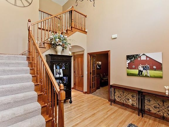 Quality built by Flynn Homes. Elegant 2 story home in Irish Hills on 1 acre lot. Open foyer to the second floor with 22ft ceilings. Beautiful red birch flooring and French doors surrounding the entrance to main floor home office and formal dining room. Kitchen is accented with cherry cabinets, granite counter tops, center island/breakfast bar, and planning desk. Main floor laundry mud room area off 3 car attached garage. Great room has built-in cabinets and gas fireplace. Exquisite bath off master bedroom suite with soaking tub and separate shower. Lower level offers bedroom and bathroom, perfect for guests. Large rec-room has impressive wet bar. Tastefully decorated with archways, cased openings, central vacuum, sound system, ceramic and wood floors. New roof in 2016. Six panel solid wood doors. Stocked pond included with association fee. City water plus well water for irrigation system and watering outside.