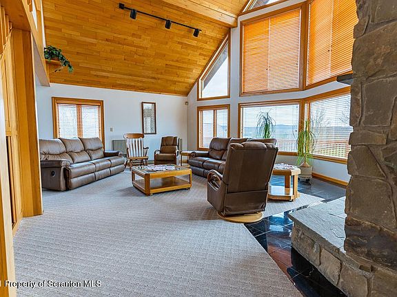 Exceptional 1987 contemporary home on an a picturesque parcel of 10 acres. There are incredible artist views of rolling hills from the front deck along with woodland views, pond and an enclosed field in the back. The home has been incredibly well maintained with a cherry kitchen and breakfast area, dining area, living room with a cathedral ceiling, 2 story stone fireplace and full glass front to let the sun shine in. No wear and tear is evident. The master bedroom and bathroom has immediate access to the exercise room with mirrored wall and access to a private deck with additional views. The second floor loft is currently used as an office but can double as an additional bedroom and has ample storage.. In the lower level there are two more bedrooms along with a jaccuzzi and shower, full bathroom and walk in cedar closet, 1/2 bathroom and bedroom. There is a built in 2 car garage along with a detached 3 car garage with built in storage. New roof on garage and home in 2019, water heater and refrigerator just replaced. laundry/ guest 1/2 bath main floor. The location is a short walk to Lackawanna State Park and not far from the University of Scranton, Penn State branch campus, Marywood College & College Misericordia. Enjoy a short drive to Montage Mt. and Elk Mt. for skiing. Only 2 hrs to NYC and 2 hrs to Philly.