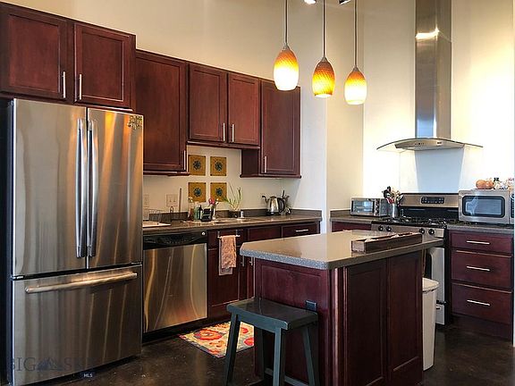 Charming third floor condo in The Village Downtown. This spacious 1414 sq ft. 2 bedroom 2 full bathroom loft is conveniently located to many restaurants and shopping in downtown Bozeman. High quality finishes include hard surface counters, gas fireplace, radiant floor heat, high ceilings and wonderful views to the west. The master bedroom has its own full bath, second bedroom has a detached full bath and views to the Bridger mountains. Sit out on the balcony and enjoy the beautiful Montana sunsets! Underground heated parking and storage, coded access and open air courtyard.