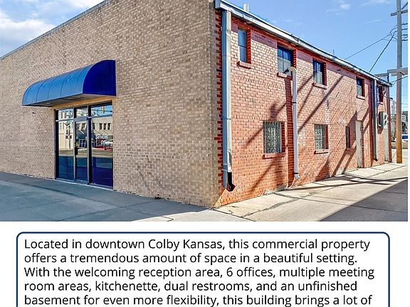 Located in downtown Colby Kansas, this commercial property offers a tremendous amount of space in a beautiful setting. With the welcoming reception area, 6 offices, multiple meeting room areas, kitchenette, dual restrooms, and an unfinished basement for even more flexibility, this building brings a lot of potential into its 3,134 square feet.