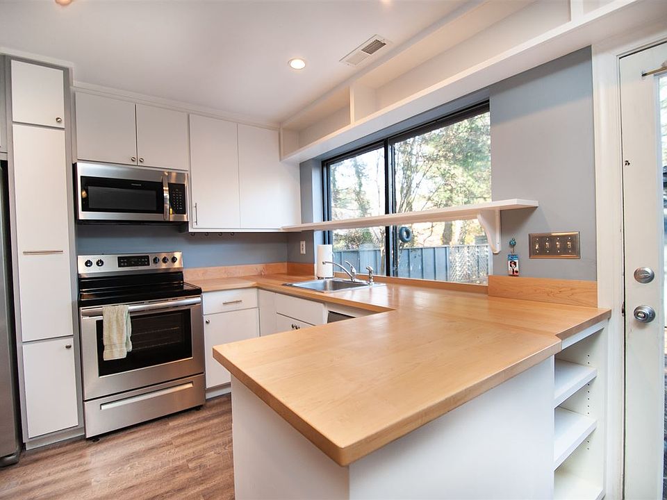 - Kitchen Cabinets/Counters: Maple Cabinets, Wood Counter