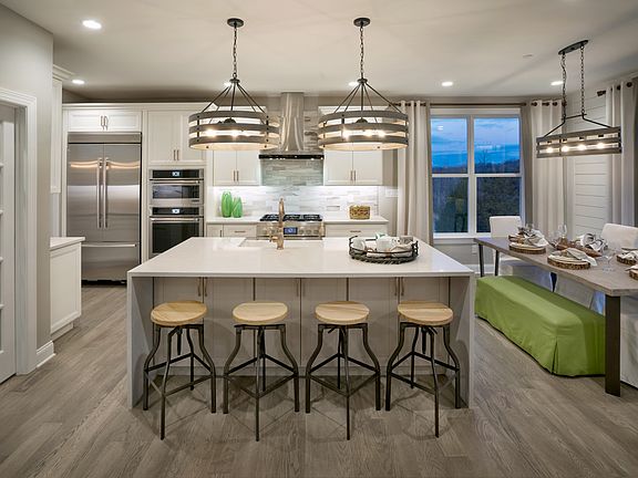 Deluxe living and entertaining. The Brookview's inviting foyer is open to the formal dining room, with views to the spacious great room beyond. The well-equipped gourmet kitchen overlooks the great room, and features a large center island, roomy walk-in pantry, ample counter and cabinet space, an adjacent casual dining area, and direct formal dining room access. The impressive primary bedroom suite features dual walk-in closets and a deluxe primary bath with dual vanities, large luxe shower with seat, separate drying and dressing areas, and private water closet. Secondary bedrooms each feature walk-in closets, two with shared bath with dual-sink vanity, and one with private full bath. Additional highlights include a desirable generous flex space adjacent to the great room, centrally located second-floor laundry, and convenient first-floor powder room and everyday entry.