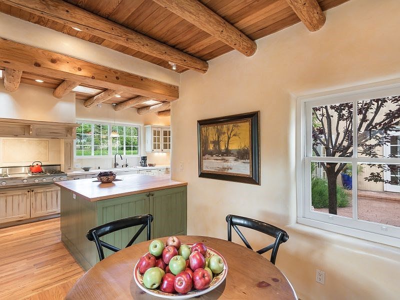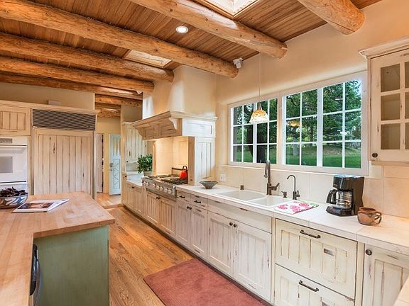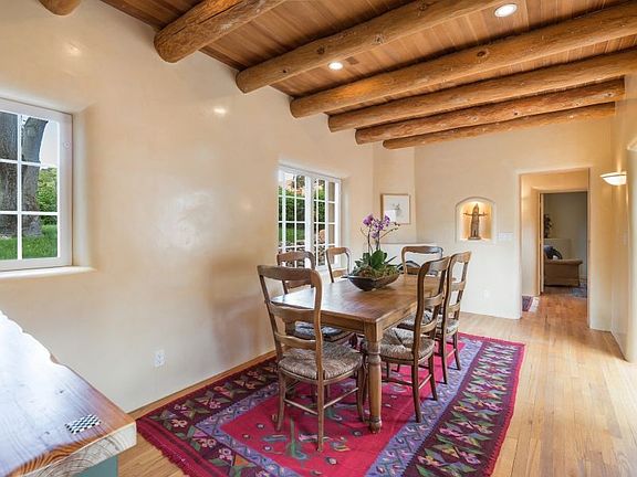 Thoughtfully sited on a little over 1 acre next to the bubbling waters of the Santa Fe River, this original adobe and frame Hacienda designed home has been carefully updated to embrace modern comfort and styling while accentuating the original 1930s Pueblo details. Just minutes from downtown, the home has 3 bedrooms, as well as an intimate study/office, each overlooking lush and landscaped gardens and treetop views. From the formal library, a large and airy Trey Jordan designed living room/entertainment area is detailed with several quiet and luxurious spaces, as well as a chic bar area, all overlooking the heavily wooded foothill views. Tall glass view windows and glass doors open onto a large screened-in porch, with hot tub access just outside. The entire home flows harmoniously with hardwood flooring, vigas and latillas, and plaster walls all situated around a private bricked courtyard. A separate studio space was built next to the two-car garage with ample light from skylights and large view windows. Private and secure, this gracious estate backs up to well-protected foothill views. Overlooking coveted and pristine Santa Fe River fauna and flora, a sense of timelessness and peace are infused in the air. The acequia waters continue to flow making this property a vision for those who have come to love the symbolic traditions of Northern New Mexico.