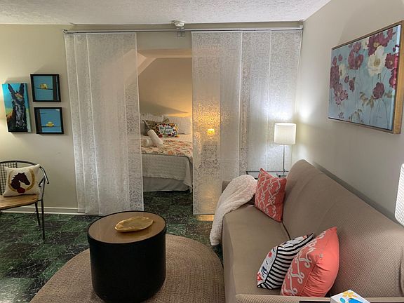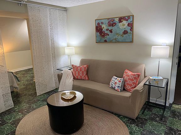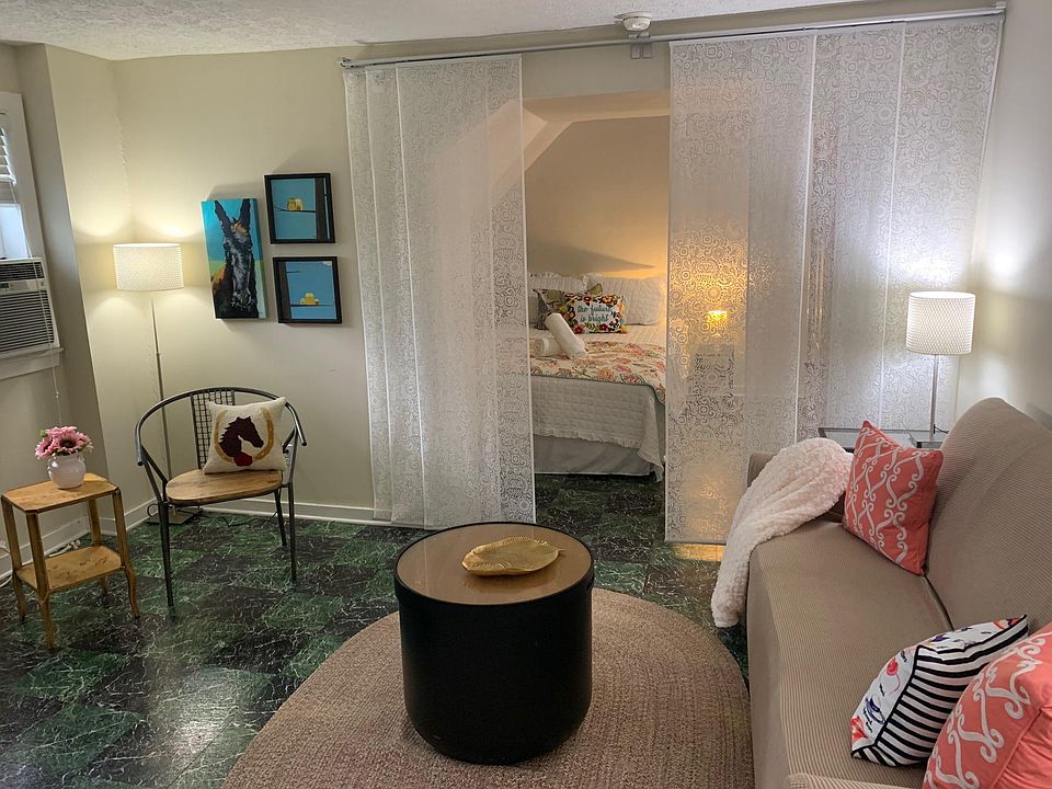 As with all the apartments in this Cherokee Triangle landmark home, enjoy the use of the 1800 Sq Ft front porch to people watch, read, browse the internet . This apartment has a birds-eye view of Everette Avenue! This quiet apartment offers privacy like no other unit with coziness that feels like home immediately walking in! This third-floor apartment is completely furnished, including a queen-size bed, dining table, couch, chest of drawers, flat-screen TV, cookware, utensils, linens, and towels. The kitchen has a refrigerator, sink, microwave, coffee pot, and a stove. A coin-operated laundry is located on-site. Utilities, WiFi, and off-street parking is included in the price. This apartment is perfect for a single person on a budget as it is priced a bit under market due to not being able to stand up to take a shower. Monthly discount for stays of 4 months or longer. This apartment is completely furnished including kitchenware and linens. All utilities, including the internet, are included in the price.