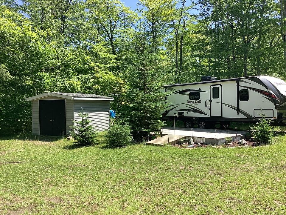 Great wooded lot ready for camping, hunting or as a homesite. Rare zoning area on the island that permits mobile homes or custom conventional homes! There are concrete leveling pads installed for parking a camper and a 10 x 12 shed. Electric is already installed on site and there is a cleared area with firepit, also there are walking trails.