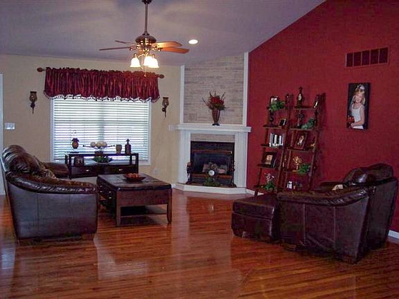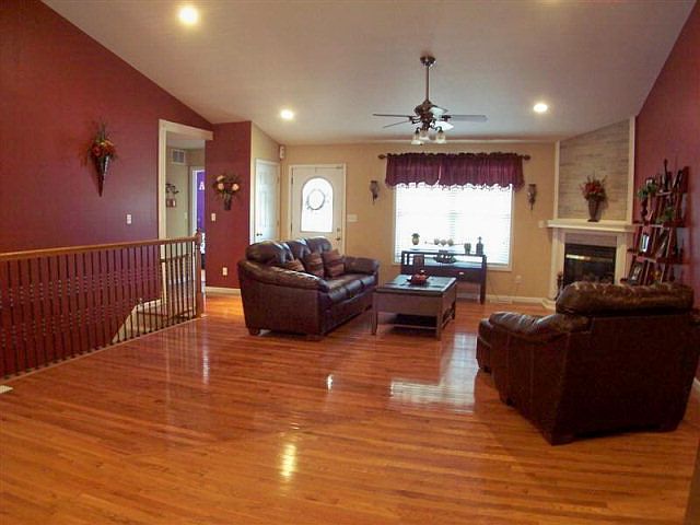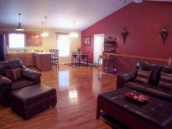 Awesome open great room with vaulted ceiling and beautiful hardwood floors. Gas log fireplace. Raised panel cabinets and breakfast bar. Dining area opens to covered maintenance free deck. Split bedroom design. Huge master bedroom with walk in closet & private bath. Nice laundry room off kitchen with cabients. Open stairway down to spacious family room 43.5x15+12.2x16 L-shape with wet bar loaded with raised panel cabinets. Two bedrooms down plus full bath. Suspended garage has great workshop space to include wet sink, workbench and lots of wooden shelving plus full concrete drive to 3rd garage. Tree lined backyard for privacy. Quiet cul-de-sac. This lovely ranch is loaded with space!
