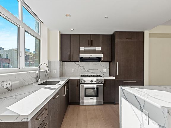 Beautiful south and east facing corner unit at 1400 Hudson St. with partial river and city views. Natural light streams throughout the living room, kitchen, and dining space. The large bedrooms are set away from the living space. The home features wide plank oak floors, quartz counter tops, custom lighting, Bosch and Thermador appliances, Nest temperature regulation, and custom closets, walk-in in the primary bedroom. Building features world class amenities including a 24-hour Concierge, Rooftop Pool, Rooftop Deck with Fireplace & Grills, Fitness Centers & Yoga Room, Children's playroom, Residence Lounge, Game Room, and shuttle to the PATH. The building is just steps from the Hoboken North ferry, allowing residents to be in midtown in 15 minutes. Parking is available for rent close by.