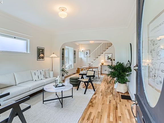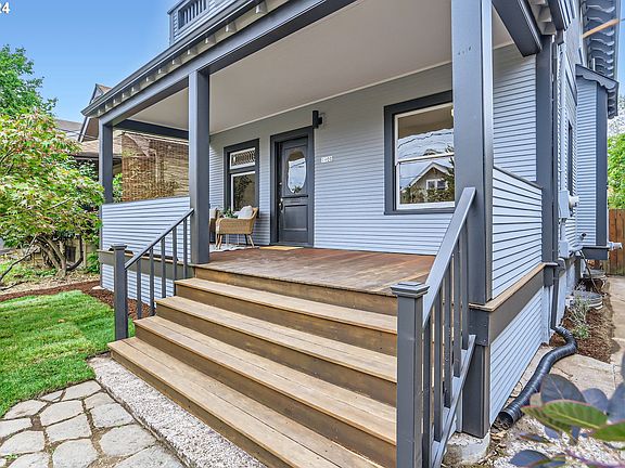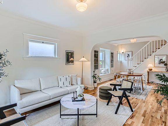 This beautifully reimagined Alberta Craftsman is a masterpiece of thoughtful design & modern luxuries. Newly refinished warm oak hardwoods and soaring ceilings are accented by period detailing throughout such as leaded glass and original built-ins. The upgraded kitchen features sleek quartz countertops, new cabinetry,and a tile backsplash. The adjacent eating area offers flexibility to expand your kitchen footprint. This,combined with the adjacent bedroom/media room and French doors with access to the yard create an ideal setting to entertain guests. Upstairs, prepare to be WOWed. Both bedrooms offer spacious walk-in closets and private en suite bathrooms, with maple floors perfectly contrasting the Douglas Fir trim. The primary suite is a sanctuary in itself, with a cozy sitting area, vaulted ceilings, and a unique loft accessed by an antique rolling library ladder. Imagine this very large space as your personal library, office, or yoga retreat. The ensuite bath, with double sinks,includes an expansive walk-in shower & elegant tile worK.Step onto your private balcony and enjoy panoramic views of the rooftops and the surrounding neighborhood. It's an ideal perch to sip coffee or a cocktail any time of day. The 2nd bedroom upstairs also has a fantastic walk-in closet and an ensuite bath with Ann Sacks tile and a claw foot tub. You'll love the dual faucet wall-mounted sink for ultimate convenience. The lower level is an unfinished basement with enough ceiling height to add even more finished sqft. The walls were recently skim-coated and the house seismic strapped. All new interior and exterior paint (2024), 97% eff gas furnace,and upgraded mechanicals.The backyard has a slate stone patio and grass and is an excellent space to create your dream garden. Located on a tranquil cul-de-sac, this very peaceful location is just steps from Alberta’s vibrant shops and top restaurants. Excellent Bikescore.Enjoy Alberta Park & King Farmer's market nearby... this home has it all! [Home Energy Score = 3. HES Report at https://rpt.greenbuildingregistry.com/hes/OR10232288]