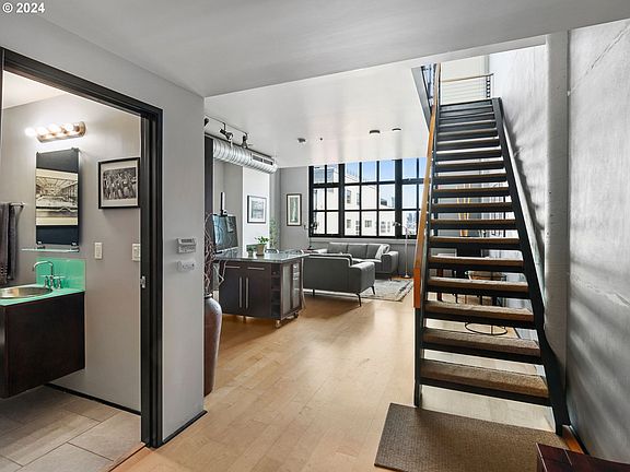Indulge in the fabulous city life while residing in the Pearl District loft of your dreams! Live in a piece of historic Portland in The Avenue Lofts, built in 1923 and converted from the Meier & Frank department store warehouse into contemporary lofts in 2004. Immediately upon entrance into the open kitchen, dining & living great room is a wall of windows spanning both levels of the unit with expansive east-facing city views. The 1,369 square foot two-story unit is located on the top level of the building and includes a loft-style bedroom and one and a half bathrooms. Enjoy loft-like aesthetics like exposed duct work, concrete walls, hardwood floors, and track lighting. The chef's kitchen has a gas range, an island/eating bar, and storage space. Escape to the upstairs primary suite, which has additional flex space for an office or sitting room and a bathroom with dual sinks, tile floors, and a shower/tub. Appreciate the common amenities like a shared space atrium with BBQs perfect for entertaining, or check out the on-site weight room. This unit includes a deeded, secure parking space and extensive storage. Take advantage of everything the Pearl District offers, including award-winning restaurants, boutiques, Whole Foods, and entertainment right out your front door.