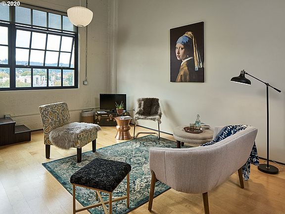 Light filled, penthouse level loft has 15' ceilings and unobstructed views of the west hills. Custom platform king-sized hideaway bed, gas range, stainless steel appliances and washer/dryer included.Maple cabinets and wardrobes with built-in shelves maximize efficiency. Motivated seller offering amazing opportunity to invest in an original warehouse to loft conversion. Get ready to socialize again with culture, convenience and fine dining just outside your door!