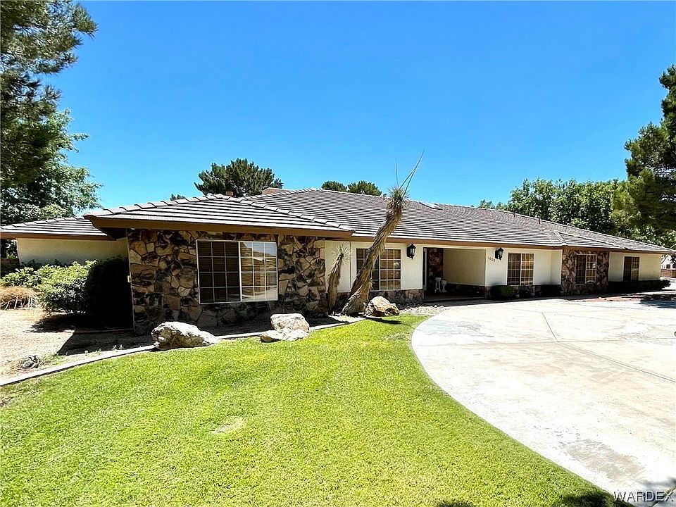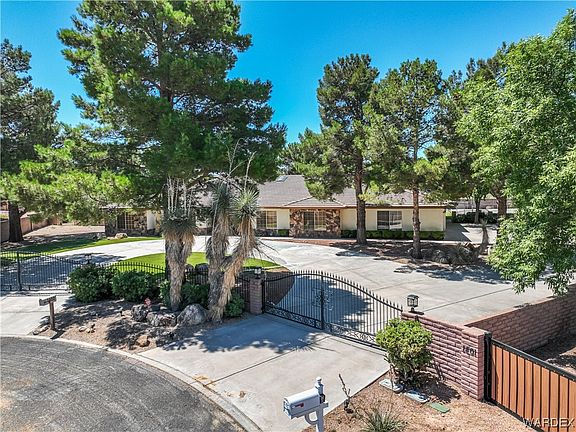 Come check out this beautiful custom home in Quail Ridge Estates today! This home is one of a kind and sits at the end of a quiet cul de sac in the heart of Kingman. Pulling up to the home you come to two electric entry gates for nice privacy and security. The property has a semi circle drive way in front of the home and a driveway leading to the side of the house and the 4 car garage. The yard is fully landscaped with a block wall and sits at 0.96 acres. Fully fenced and lighted sports court for endless activities. Mature landscaping and trees give a lot of shade and privacy in the backyard. Plenty of parking for your toys, trailers or RV's. In the home you will find a spacious kitchen with a ton of cabinet and pantry space. Formal dining room is located just off the kitchen. The kitchen opens up to the living room that features a gas fireplace and skylights for great natural light. The home is a split floor plan with the master suite and 2 guest bedrooms on the east side of the house and a guest room and full bathroom on the west side of the house. Along with the living room there is an office/den just off the living room and a family or tv room on the west side of the house. Utility room with laundry and storage.