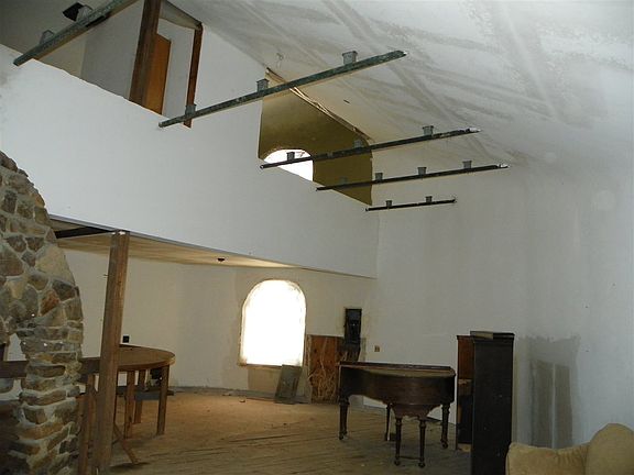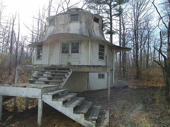 Unique unfinished 1 bedroom 1 bath home on 10 acres. This property belonged to an artist who did not get to finish it completely. The unfinished home has curved walls, a curved staircase, arched windows, large rock fireplace with conversation pit. It features an open kitchen with curved counter top and tiled walk in shower. There are two additional structures on the property one stucco two story building that was used for a kiln, the other is a three story work shop. Property is in need of some TLC.