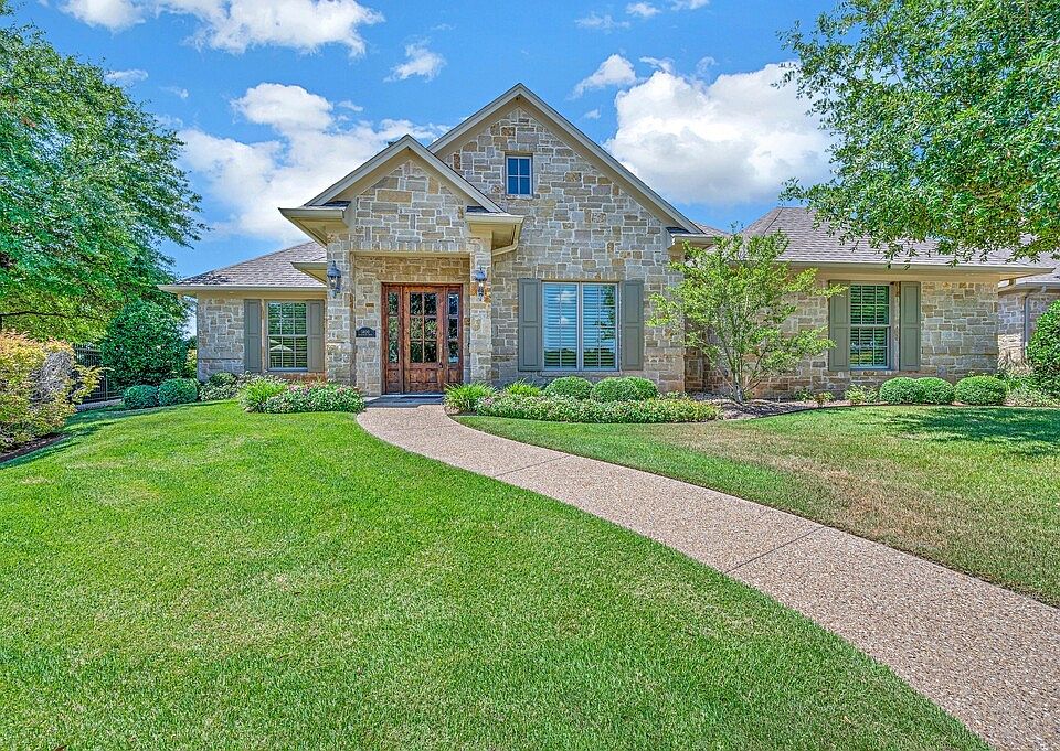 This beautiful residence in the exclusive gated community of the Oaks at Ridgewood features three bedrooms, a gourmet kitchen with granite countertops, stainless steel appliances, a built-in refrigerator, and a spacious laundry room with ample storage. Large windows, beamed ceilings, and a charming stone fireplace accentuate the open floor plan of the kitchen and living/dining areas. The main suite offers privacy, featuring dual vanities, a separate shower and tub, and a generously sized walk-in closet. Additionally, the home includes a large patio with an outdoor kitchen providing a picturesque view for outdoor entertaining and relaxation.