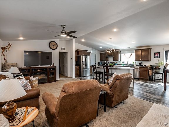 Move in ready beautiful home! Features vaulted ceilings with recessed lighting and fans! Open floor plan with attractive vinyl tile...HUGE island with breakfast bar...electric smooth top stove...dishwasher...refrigerator...pantry and casual dining area! Main bedroom features a dual sink vanity and easy access step in shower! Indoor laundry room...home has a reverse osmosis system. Also, a convenient storage container stays with the property! Live in the open range and enjoy the beautiful sunsets! Call your Realtor today for a tour!