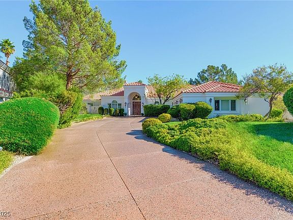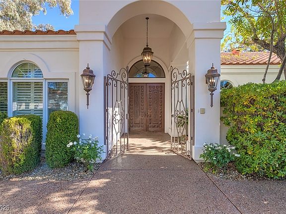 Luxurious single story custom home on expansive half acre - a rare opportunity in any Las Vegas guard gated community. Enjoy vaulted ceilings throughout this beautiful, updated entertainers dream home featuring open floor plan in formal living & dining areas. Gourmet chef's kitchen includes marble counters, 6 burner & separate wok stove, 3 ovens, Meile built-in steamer/oven, grand center island (50"x95"), oversized walk-in pantry & separate pantry closet. Nook area includes French doors to side garden. Adjacent great room includes wet bar custom upper & lower cabinets w/ 2 wine refrigerators, separate dining area, fireplace, media wall & French doors leading out to covered patio, sparkling pool & spa with expansive area to create your own private oasis/guest retreat. Primary suite offers 2 walk-in closets & 2 separate bathrooms (1 includes steam shower) Primary baths provide direct access to retreat room. Side yard includes A/C pet room. Too many custom features to list, A MUST SEE!