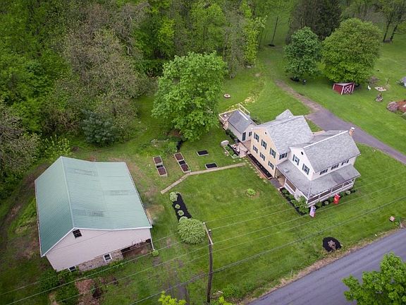 If you are searching for a home with a unique combination of old world charm and modern amenities, look no further than this beautifully renovated and expanded late 1800s farmhouse situated on a scenic 6.92 acre lot in Milford Township. You will fall in love with its exceptional melding of rustic sensibility and contemporary upgrades as well as endless possibilities offered by the home's plethora of unique features. The main house features a freshly painted wrap-around porch with distinctly Victorian style that beckons you in and opens to a spacious living room with striking wood trim, ceiling fan & neutral decor. Just off the living room is a spacious office accented by wide plank hardwood floors, a wood pellet stove and built in shelving & cabinetry. This room could easily be converted into a bedroom and there is a full bath on the first floor as well. Without a doubt though, the center piece of the home is its enormous eat-in kitchen with an open layout that makes it ideal for entertaining. The kitchen boasts granite countertops, recessed lighting, tile floors, center island with cooktop and a pass through to the adjoining dining room located inside the turret of the home. In addition, there is access to the large laundry room with laminate wood flooring and an upgraded laundry sink with tile backsplash off the kitchen and a small anteroom that leads out to an amazing outdoor entertaining space complete with a multitier patio, a former smokehouse with a deck off the back that could be utilized as additional entertainment space or as an artist studio or home office. As if that were not enough, the property also features a full finished walk up basement with tile floors and recessed lighting, a freshly painted owner's suite complete with a sitting area in the 2nd floor turret, an oversized walk-in closet and a luxurious private bath with upgraded tile floors, a jetted corner tub with tile surround, stall shower and upgraded vanity with ample storage, raised garden