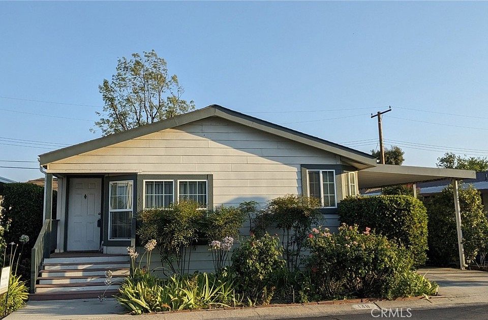 Welcome to Upland's Eldorado Mobile Home Park Community 55+ This lovely move in ready home starts with a Beautiful Rose and Iris garden in front. Single level 3 bedroom 2 bath Manufactured doublewide home comes with ample closets and cabinets. This home has an open floorplan with a Livingroom with vaulted ceiling, Dining room and Additional area for a Study/Den/office or various uses. Nicely appointed kitchen with white cabinets and white appliances. Indoor Laundry room with washer and dryer included which leads to the Carport with room for 2 vehicles. Large storage shed included. The community offers a Pool, spa and clubhouse. Senior rent control community requiring park management approval.
