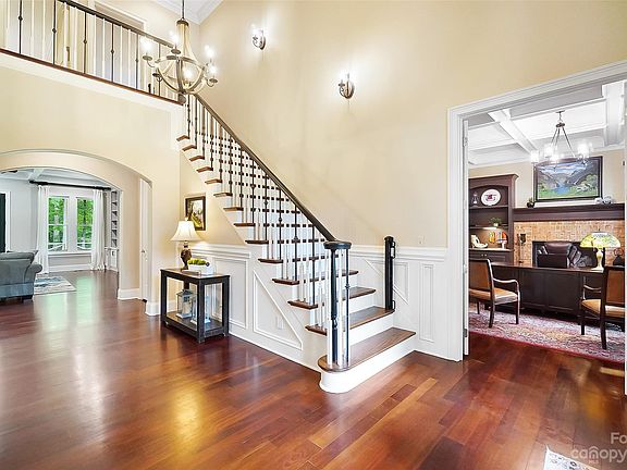 Stunning curb appeal & ultimate privacy in gated Providence Downs. Premium .75 Acre cul-de-sac lot on one of the most secluded streets in this sought after community! Magnificent floor plan w/beautiful flow & large living spaces, exceptional trim detail, arched doorways & high ceilings. Huge Primary suite on main, two story foyer, office w/built-ins & brick fireplace, large family room w/coffered ceiling & custom built-ins that opens to a covered veranda w/beautiful wooded views. Renovated chef's kitchen & Keeping room w/2nd fireplace, butcher block island, granite countertops, marble backsplash, pot filler, built in 48' refrigerator, wine chiller, walk in pantry & Viking dual fuel range. 2nd floor w/four oversized secondary bedrooms & large Bonus all w/access to full bath. Amazing storage w/ walk-in attic. Whole house water filtration system, sealed crawl space, central audio system w/built in speakers. Top Rated Marvin Schools! Great community amenities. Hurry on this one!