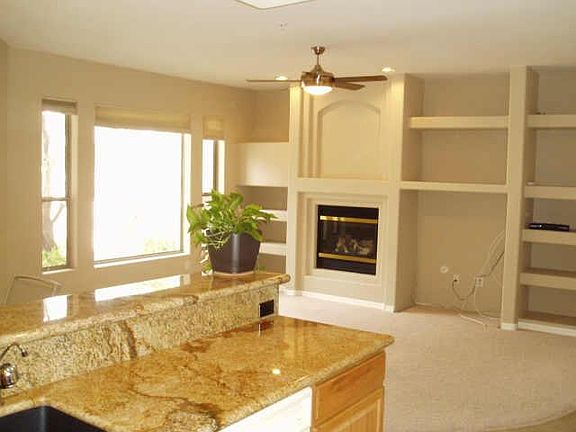 Beautiful & nicely upgraded townhome in upscale Scottsdale community*Spacious 2 bdrm/2.5 bath w/large loft,plus a huge storage area that previous owner used as a second office! Gorgeous,bright kitchen w/elegant granite counters & sink,smooth-top stove,microwave,pull-out shelves & a big double door pantry*Bisque fridge in kitchen stays as do the Kenmore washer/Whirlpool dryer that will be moved in from garage*Lots of neutral tile in downstairs traffic areas*Large dining & living areas w/built-in entertainment center*Gas fireplace*Spacious master suite w/big balcony* Prime interior location is close to 2 pools & across from putting greens* Sec Sys/R-O Sys+ceiling fans too!