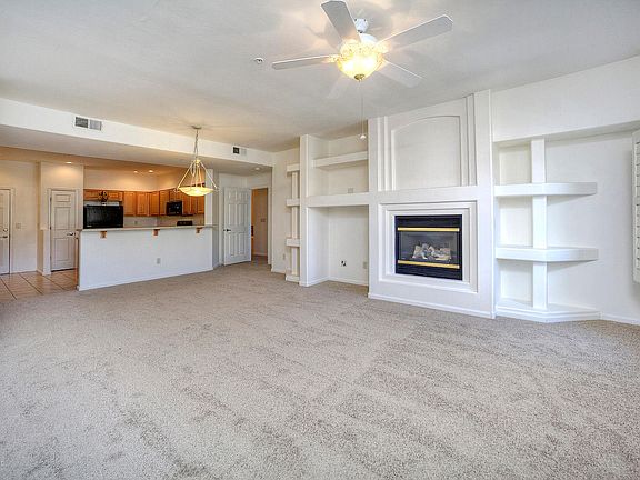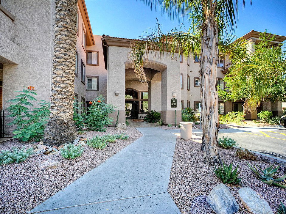 A beautiful view and a fabulous North Scottsdale location! Exceptional lock-and-leave luxury condo boasts two bedrooms plus den and two full baths, brand new carpet, and fresh paint throughout. Relax on your shaded balcony or enjoy the view from the wall of windows in the family room. Plantation shutters, built-in entertainment shelves, and gas fireplace add to the ambiance. The premier gated community features multiple heated pools and spas, lush landscape, walking paths, and tranquil fountain. Proximity to shopping, restaurants, 101 FWY, award winning golf courses, West World, and Scottsdale Waterpark puts you in the heart of it all! This is the one!