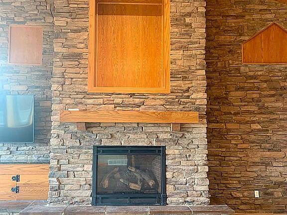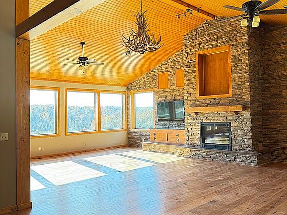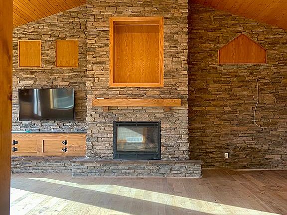 The home boasts 2 upstairs bedrooms and 2 full bathrooms. Downstairs there are 2 bedrooms and a connecting full bathroom. Upstairs has open concept living, dining, kitchen. The focal point is the amazing full wall, hand placed stone fireplace. A must see in person! The kitchen is open concept with complete walls of knotty pine cabinets, both upper and lower. Large windows bring the beautiful view outside right into your living room. Upstairs walk out onto the wrap around deck to amazing views on 3 sides of the house. 2 sides of the deck are covered.