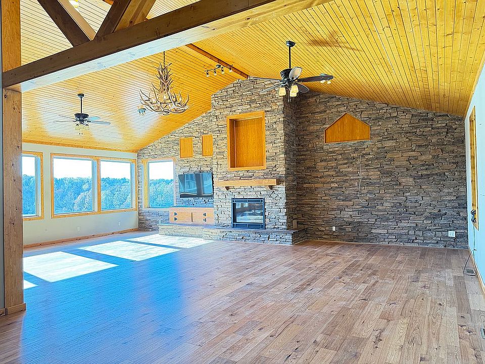 Hand placed stone fireplaceOpen concept livingWalkout basementWrap around deckLarge windowsKnotty pine cabinets