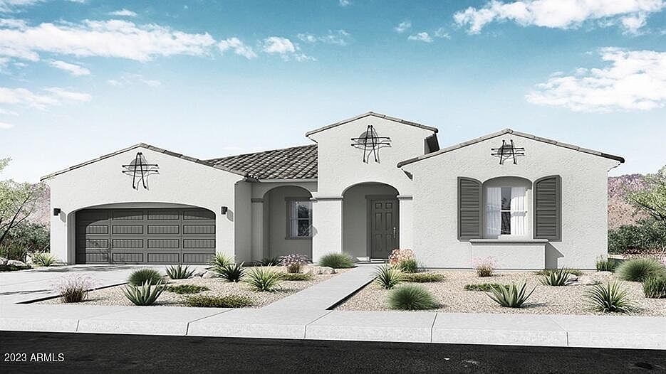 MLS#6636954 February Completion! Discover the meticulously crafted 55-RM2 in Catalonia at Rancho Mercado—a breathtaking single-story home offering 4 bedrooms, 3 baths, and an expansive 3,093 square feet of optimal living space. Thoughtful design places three secondary bedrooms at the front of the home, ensuring privacy for the owner's suite tucked away at the back. The owner's bathroom is a haven for relaxation, featuring a soaking tub, separate super walk-in shower, dual split vanity, and an enormous walk-in closet. The home seamlessly opens to a free-flowing kitchen and gathering room, extending the view to the covered outdoor living area and backyardcreating an ideal setting for entertaining family and friends. Structural options added include: Multi slide door at gathering room, pavers at front porch, driveway and entry, garage service door, soft water loop and gas line for future outdoor kitchen.